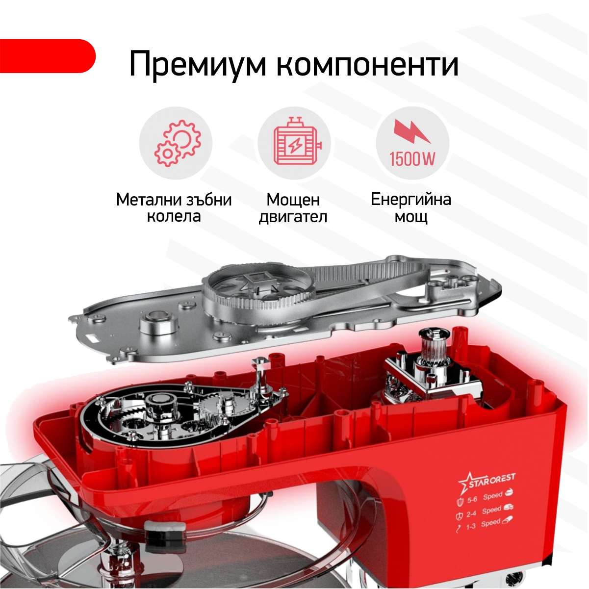 Планетарен миксер STARCREST SKM-1500 RED, 1500W, Купа 5.5 L Inox